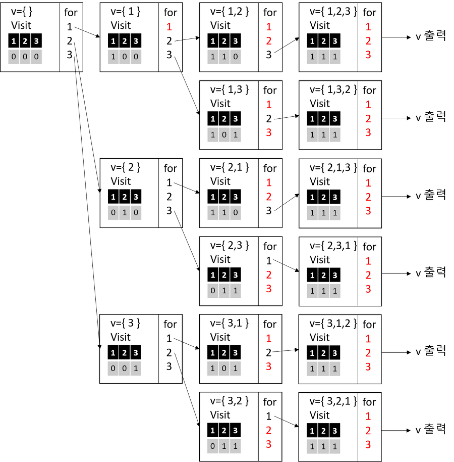 첫째 줄부터 N!개의 줄에 걸쳐서 모든 순열을 사전순으로 출력한다.