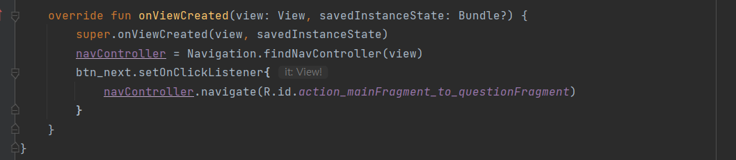 코드: btn_next를 클릭시 navController가 mainF-> questionF로 action하는 것을 구현.