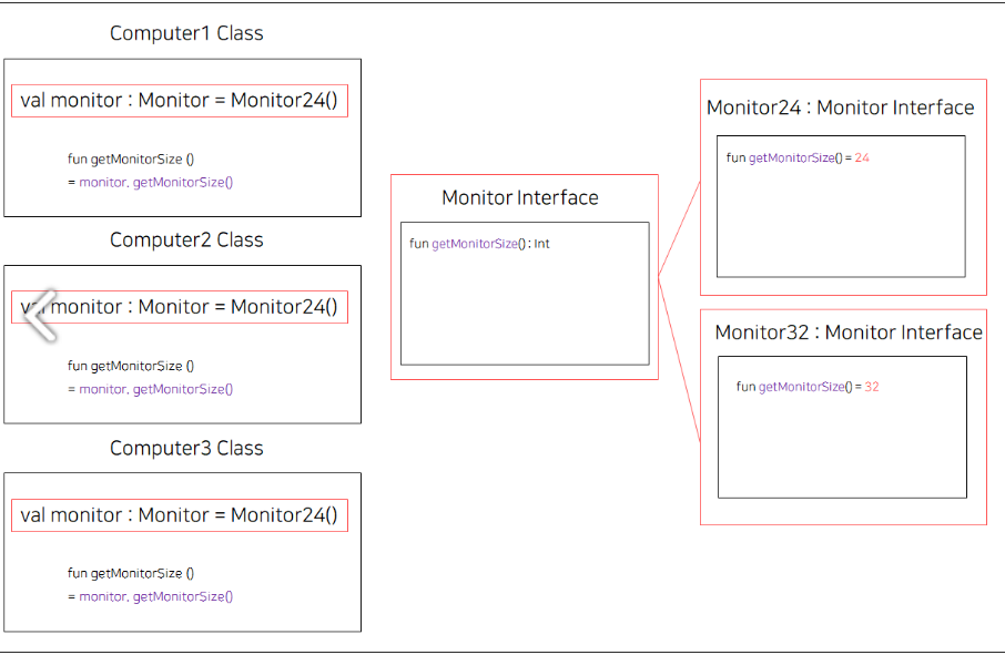 만약 24인치 모니터 출력을 32인치 모니터로 바꾸면 위 그림에서 각 computer 클래스의 monitor를 Monitor32()로 전부 바꿔줘야한다. 24->32 만 변경했지만 3줄을 바꿔야하는 비효율이 발생한 것이다.