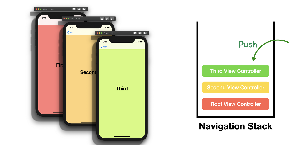 Navigation Stack: Navigation Controller는 child view Controller를 stack 형식으로 가지고 있다. 첫번째 View Controller는 root view controller가 되고 stack에 가장 아래에 위치하게 된다. 마지막에 있는 요소는 현재 보여지고 있는 view Controller를 의미한다. segue나 다른 메소드를 이용해 view controller를 추가 또는 제거할 수 있다.