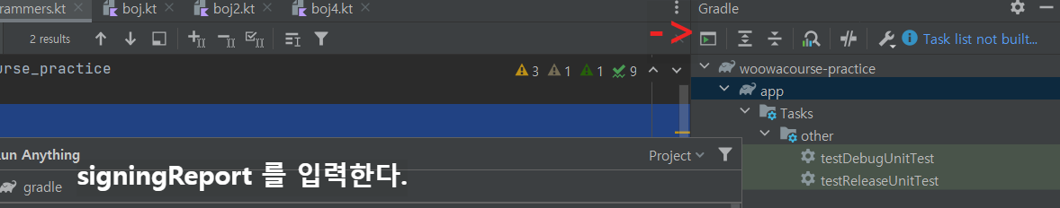프로젝트의 오른쪽에 코끼리 아이콘과 함께있는 gradle 창을 누른다.