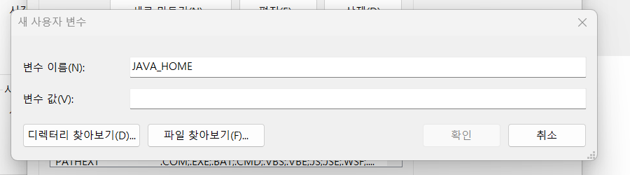 변수 이름은 JAVA_HOME으로 설정하고 위에서 복사한 경로를 변수값에 넣는다.