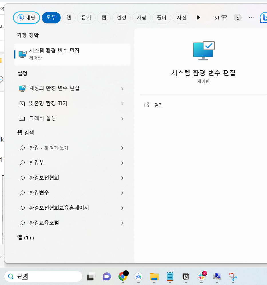 그리고 window 검색창에 환경 변수 편집을 검색한다. 시스템 환경 변수 편집을 누르면된다.