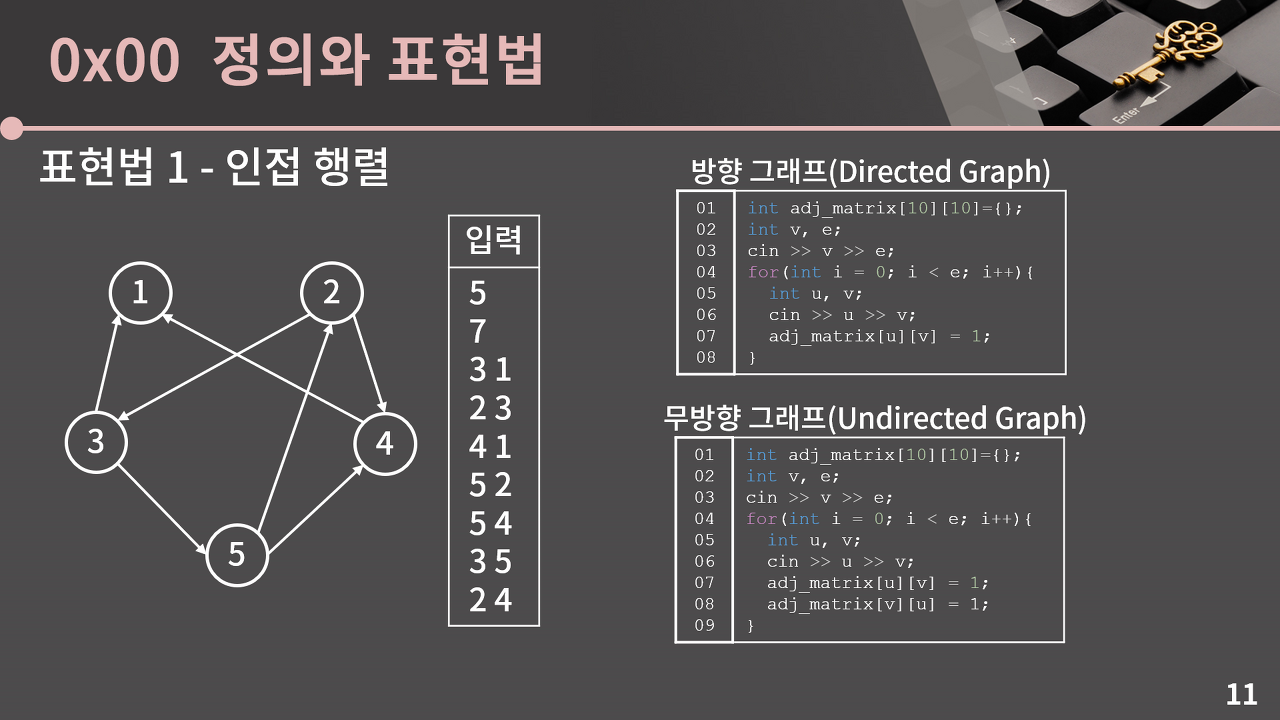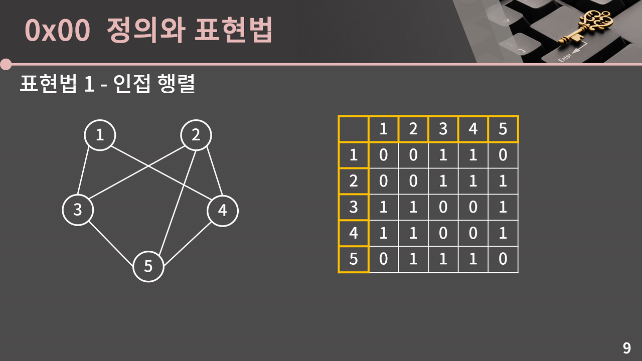 vertex * vertex의 2차원 배열을 만들어서 각 vertex의 간선이 존재하면 양방향일 경우 두 vertex에 각 칸을 전부 1로 세팅, 단방향일 경우 해당 칸에만 1로 set해서 그래프를 표현할 수 있다.