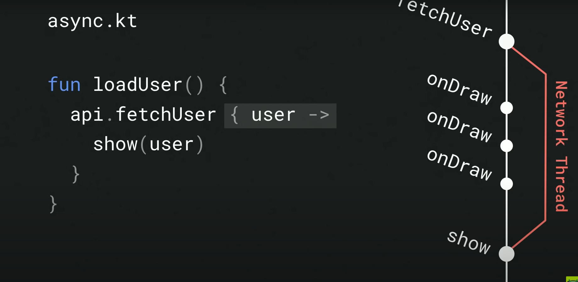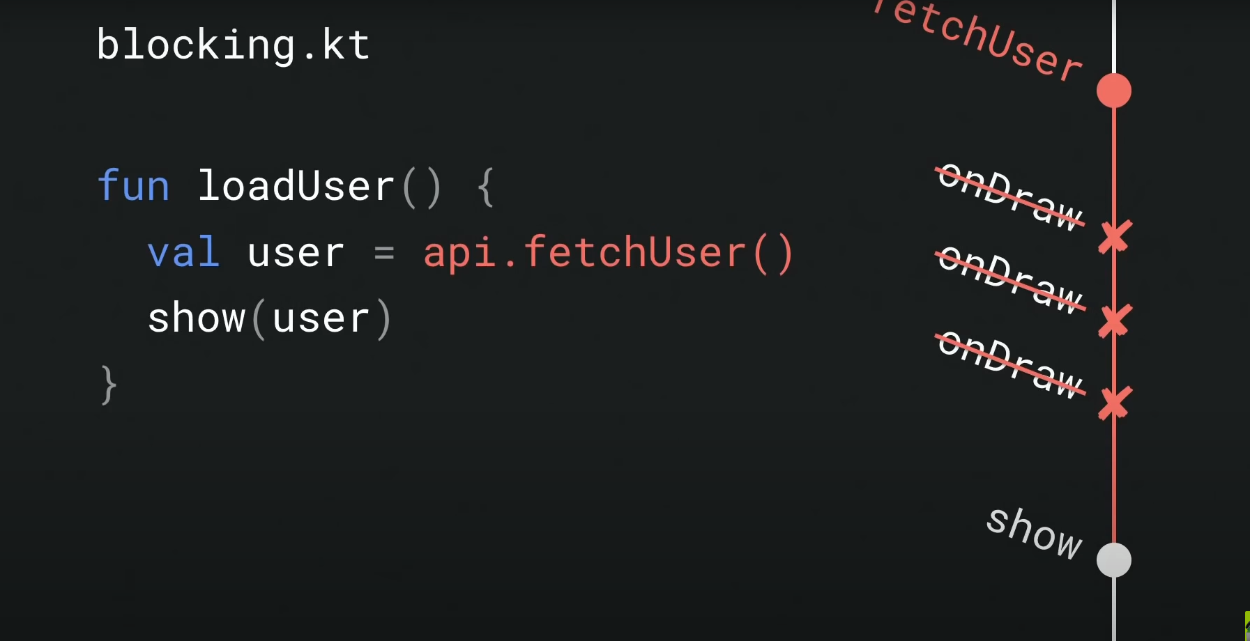 예시는 suspend 를 이용하지 않은 코드로 서버에서 user 데이터를 가져오고, 해당 데이터를 ui에 그리는 코드이다.