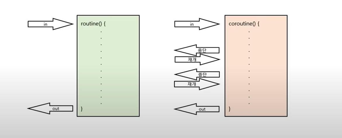 루틴이 입구와 출구가 하나라면, 코루틴은 중단과 재개가 계속될 수 있는 즉 입구와 출구가 여러개라고 할 수 있다.