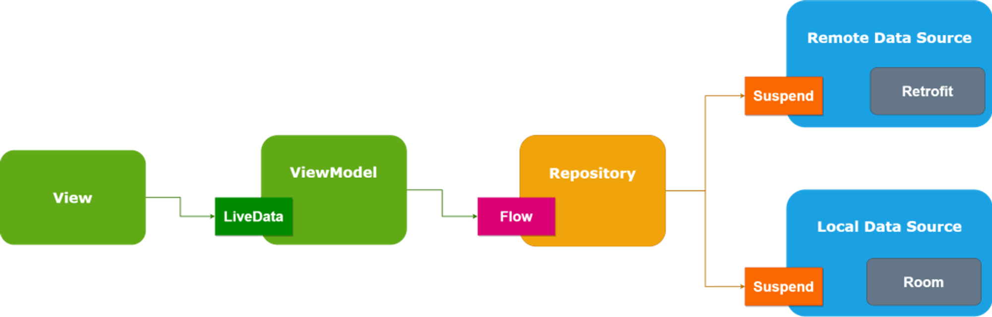- LiveData 는 UI 에 밀접하게 연관되어 있기 때문에 Data Layer 에서 비동기 방식으로 데이터를 처리하기에 자연스러운 방법이 없다.