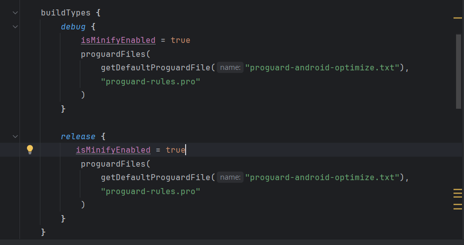 - build.gradle 파일에서 buildTypes 중 원하는 타입의 isMinifyEnabled 속성의 값을 true로 설정하면 된다.
