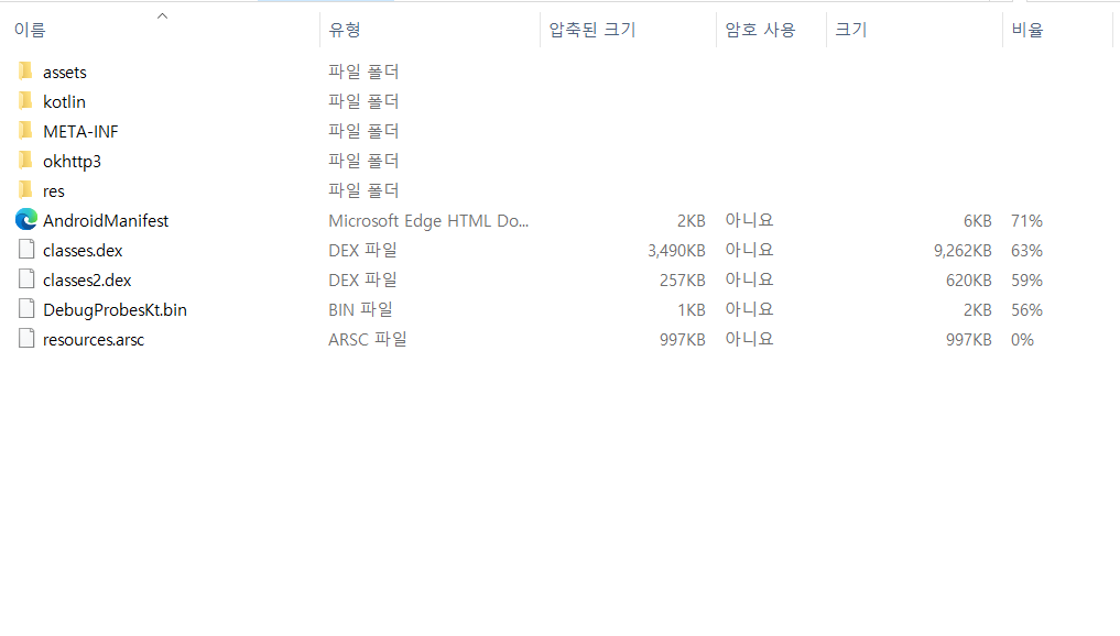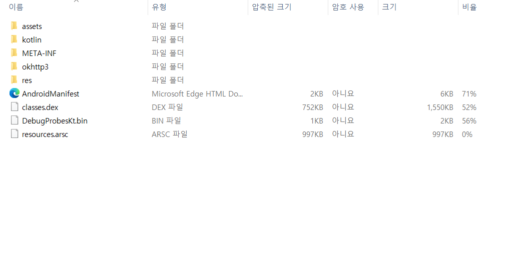 [그림 7]과 [그림 8]을 비교했을 때 경량화한 경우 2개의 dex 파일이 1개로 축소된다.