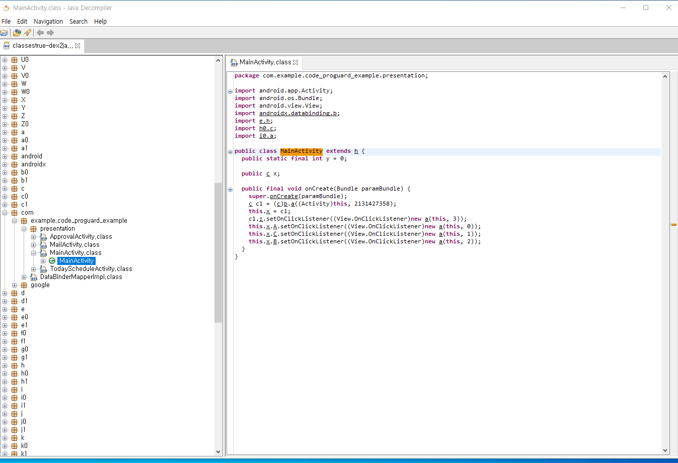 난독화 적용 시 기존 코드의 클래스 이름과 변수 이름이 모두 숨겨진다.