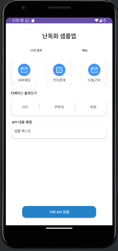 - 따라서 보통의 서비스들이 필수적으로 사용하는 retrofit 서버 통신, 받아온 데이터를 가공해서 뷰에 띄우는 등의 기능을 축약하여 샘플 앱에 적용해보았다.