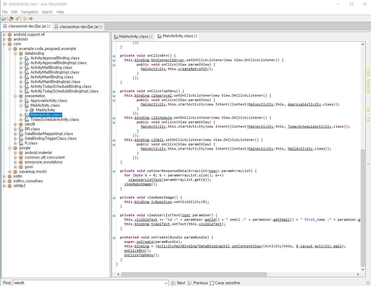 즉, Proguard는 컴파일된 앱 패키지의 코드를 난독화하여 다른 사람이 해당 패키지를 디컴파일 했을 때 해독하기 어렵게 만드는 일종의 보안 장치이다.