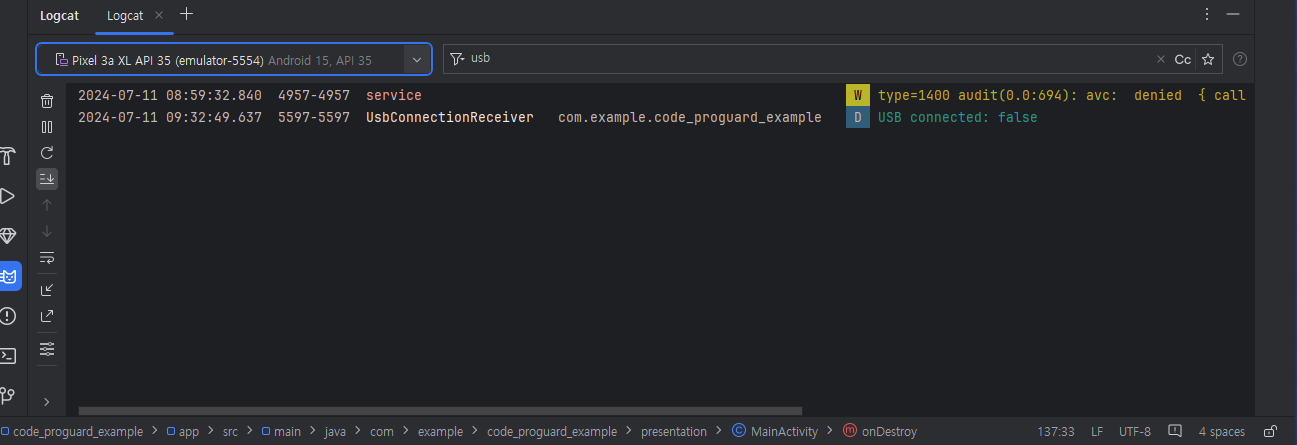intent의 action을 활용해 usb 탐지를 확인하는 코드는 다음과 같다.