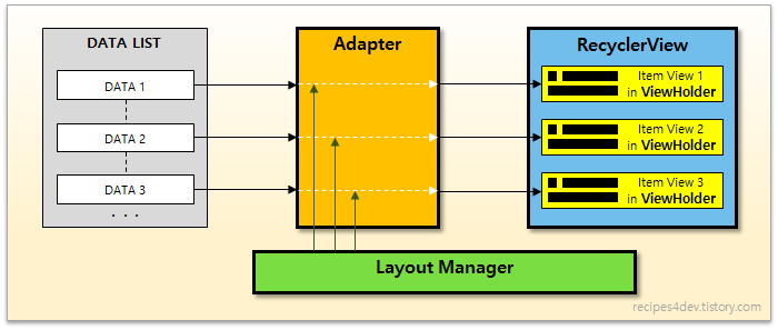 - 100개의 리스트가 있다면 100개의 뷰를 다 만드는 것이 아닌 화면에 보여지는 뷰만큼 만든뒤 아래로 내릴 수록 화면에서 사라지는 뷰들이 다시 새롭게 아래로 보여져 뷰를 재활용 한다. = 그래서 Recycler View 이다.