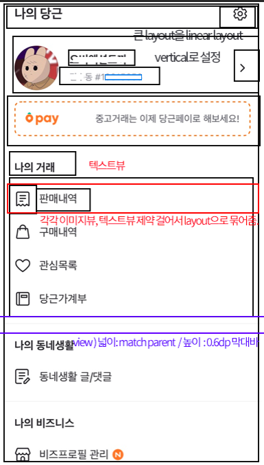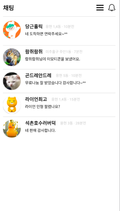 - 본래 채팅이나 홈에 판매하는 상품이 있는 목록은 item을 만들고 recyclerview를 적용해서 만들어야 하지만 레이아웃만 만들기 위해서 하드코딩으로 화면을 만들었다.