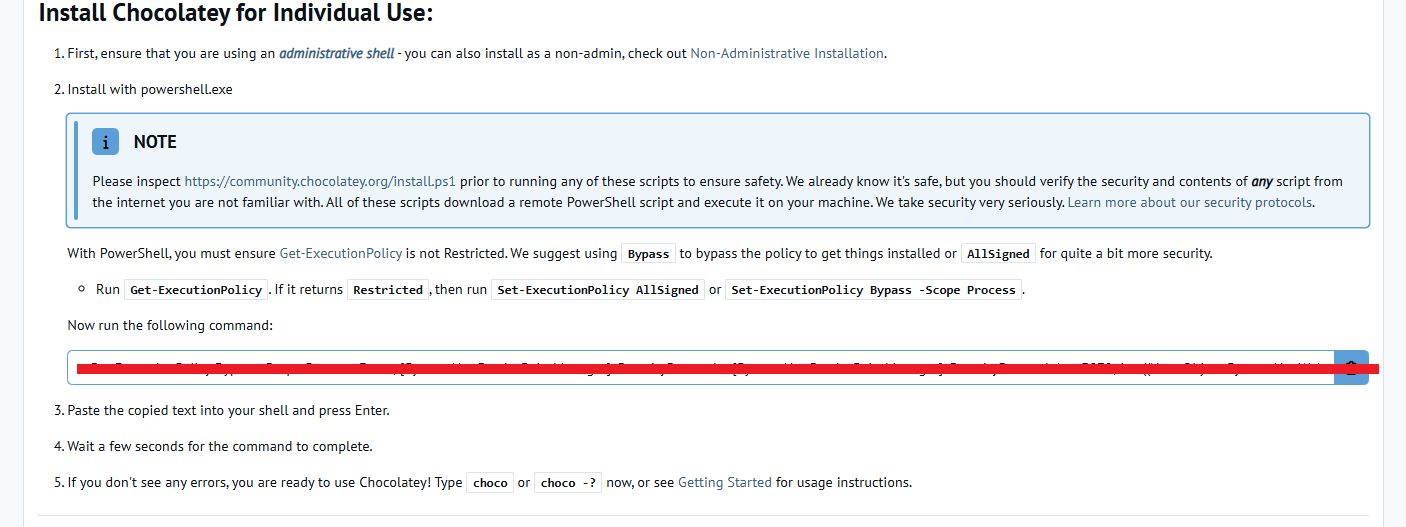 해당 사이트에 들어가서 Install Chocolatey for Individual Use 아래 내용을 복사한다.