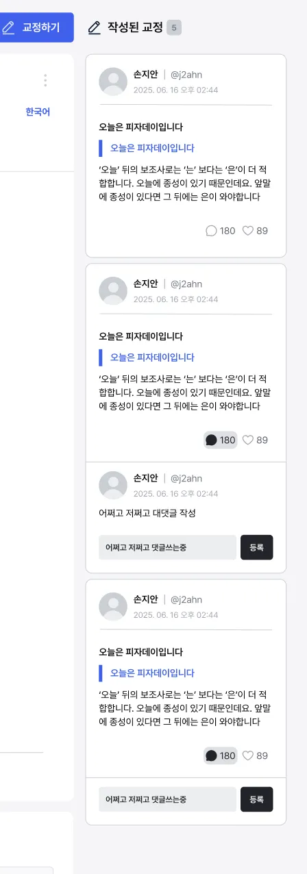 이와같이 작성된 교정 리스트 내, 현재 사용자가 좋아요를 눌렀는지 여부를 Frontend에 전달해야 했습니다.