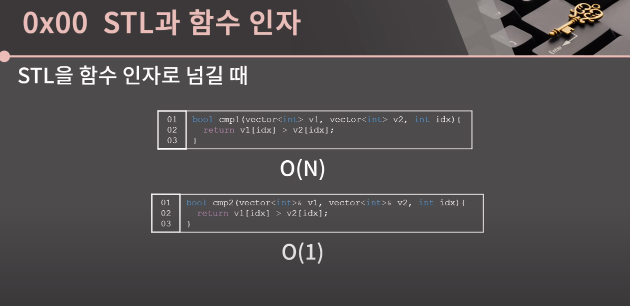- stl 벡터를 함수 인자로 넘길때 이를 복사하는 과정이 필요하기 때문에 O(N) 걸림